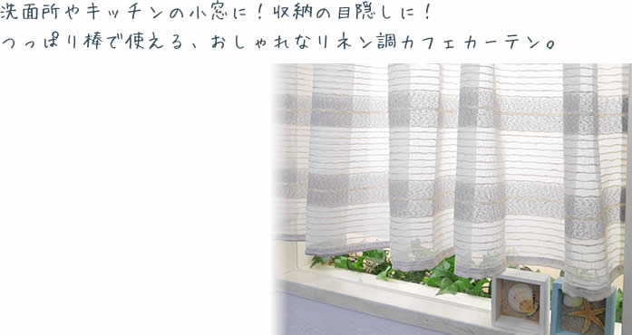 ランダムに横に走る麻のような色味の糸が天然素材の風合いをかもしだす、透明感のあるボーダー柄のナチュラルカフェカーテン。
