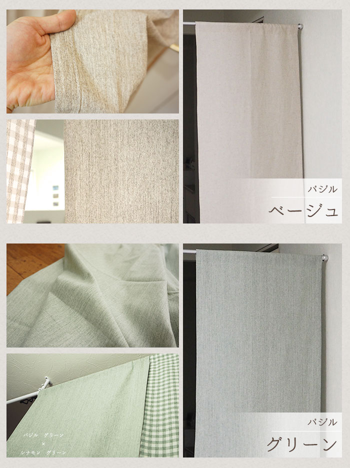 サイズ 幅45cm×丈150cm 納期 即納可 材質 バジル/ベージュ・グリーン シナモン/ベージュ・グリーン 綿100% オリーブ/キナリ・ネイビー 綿50% 麻50% 仕様 上部…袋縫い(5cm) 下部・サイド…三巻縫製 保証 3年保証付き ※万が一、正常な使用状態で本商品に故障が生じた場合、保証期間中の商品交換保証をお約束いたします。